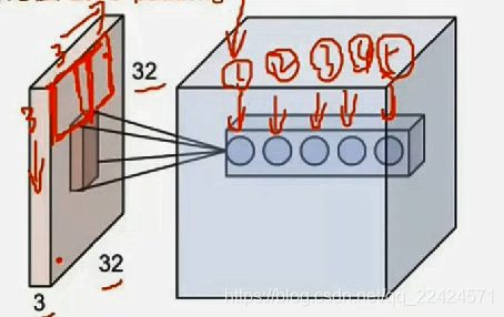 深度/depth----图中圆圈的个数,即神经元个数,每个圆圈代表一个滑动窗口,窗口内每个像素都有一个权重w;