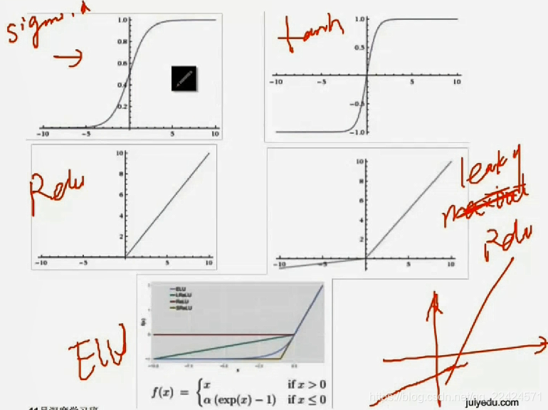 缺点---全部数据都在小于0部分---概率小!-----leak Relu来修正!小于0部分斜率很小!放一部分进去!
