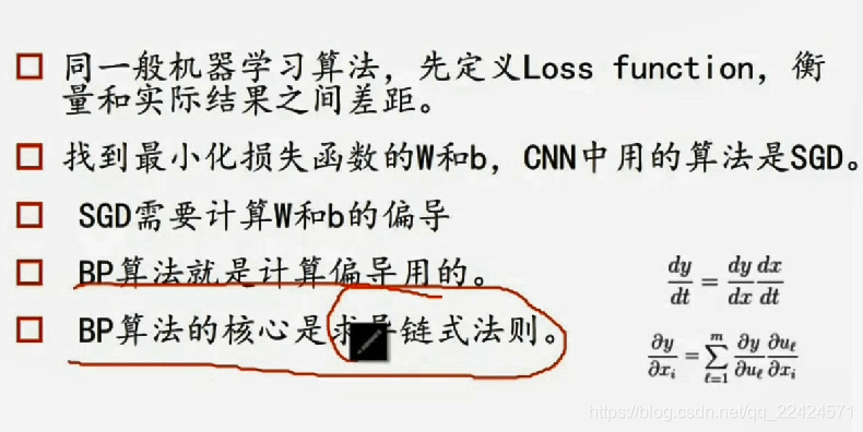 2)找到最小化损失函数的W和b-------SGD算法/随机梯度下降法(求W和b的偏导数-----BP算法--求导的链式法则求dW和db)